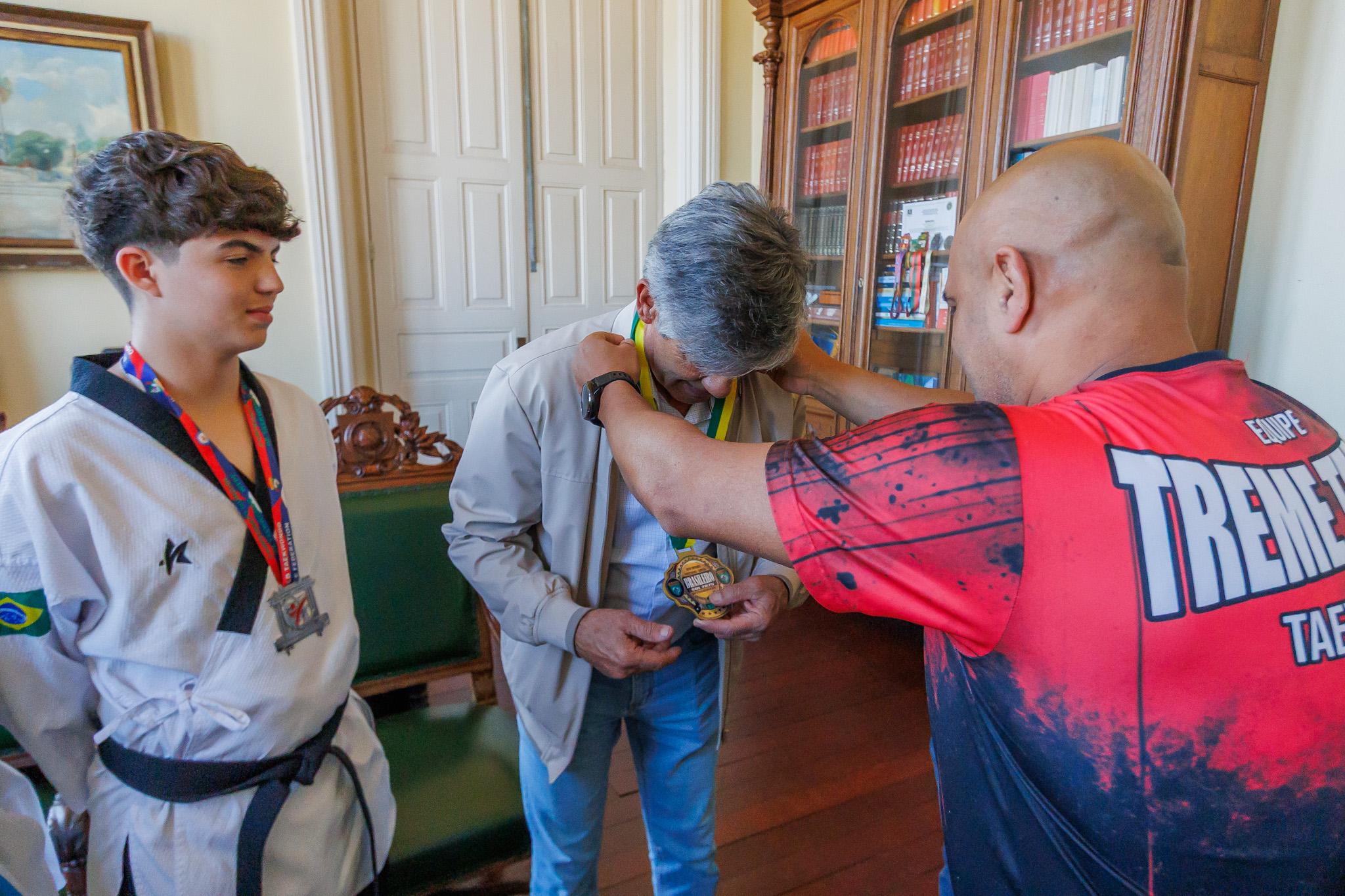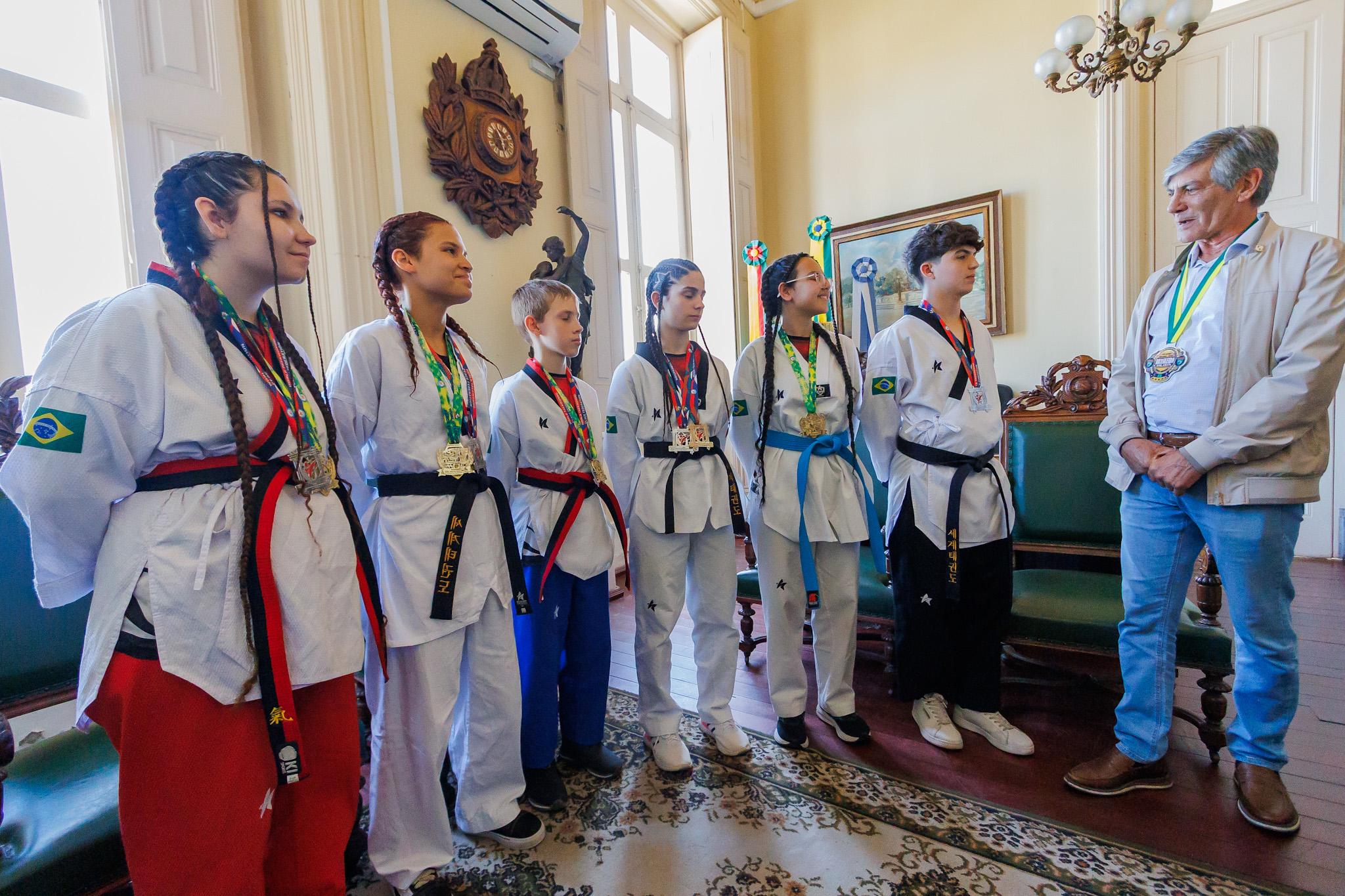 Prefeito, Fernando Marroni, recebe a delegação pelotense do Mundial de Taekwondo. Foto: Volmer Perez/Secom
