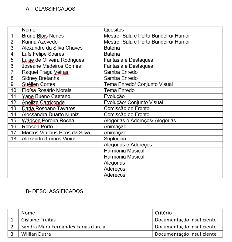 A Secretaria de Cultura (Secult) informa que os profissionais foram selecionados mediante análise dos documentos comprobatórios, considerando-se os seguintes critérios de pontuação: Experiência Técnica (50%): Tempo de atuação na área escolhida; Formação Acadêmica/Prática (30%): Cursos, graduações ou títulos de mestre ou doutor (notório saber); Experiência em Carnaval (20%): Atuações anteriores em corpos de jurados ou produção carnavalesca.