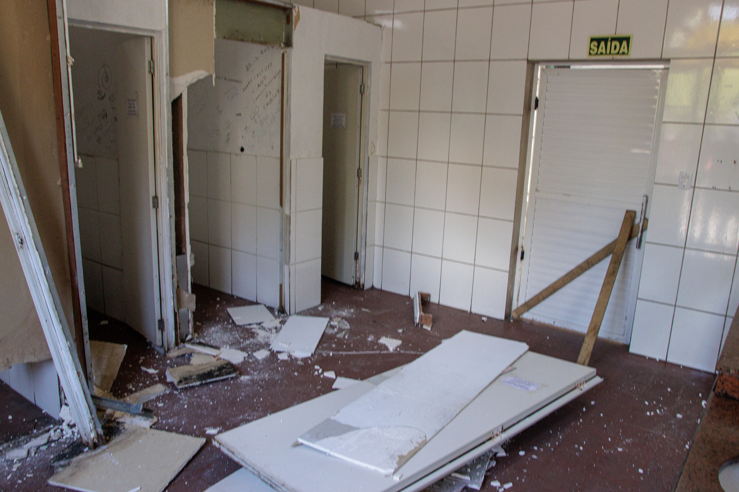 Vista interna do banheiro feminino no Mercado Central, que começou a ser reformado na manhã desta segunda-feira (13) com recursos de medida compensatória no valor de R$ 137.6 mil (Fotos: Tobias Bernardo/Secom)