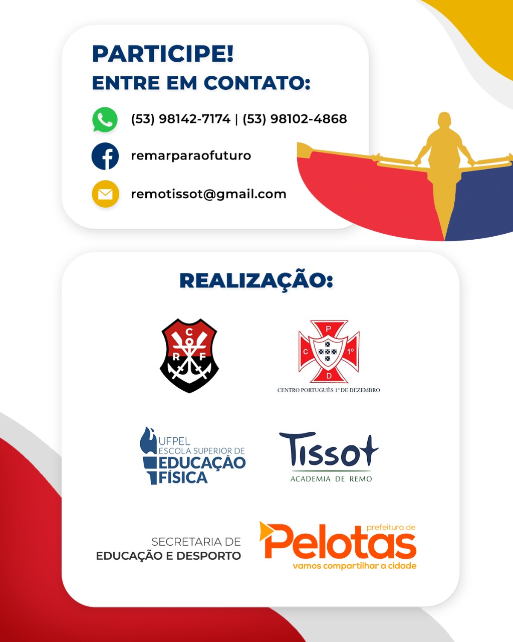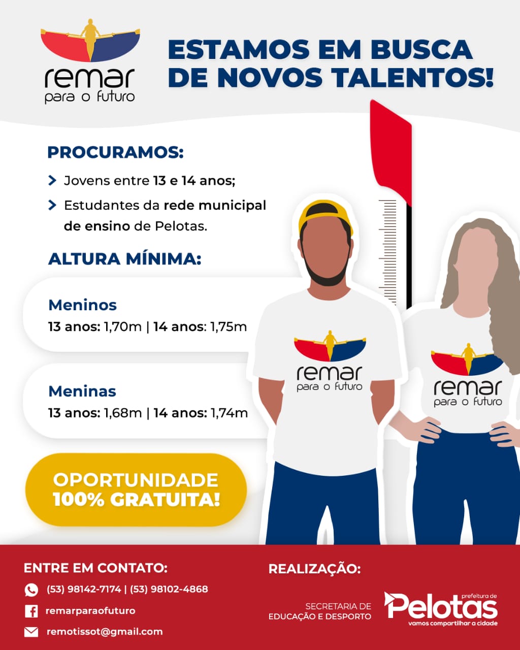 O projeto Remar para o Futuro, que trabalha a prática do remo com estudantes da rede municipal de ensino de Pelotas, está com inscrições abertas para uma pré-seleção de novos talentos. As vagas são voltadas a adolescentes de 13 e 14 anos, estudantes do Município, que preencham alguns requisitos de altura mínima, necessária para a modalidade do esporte.